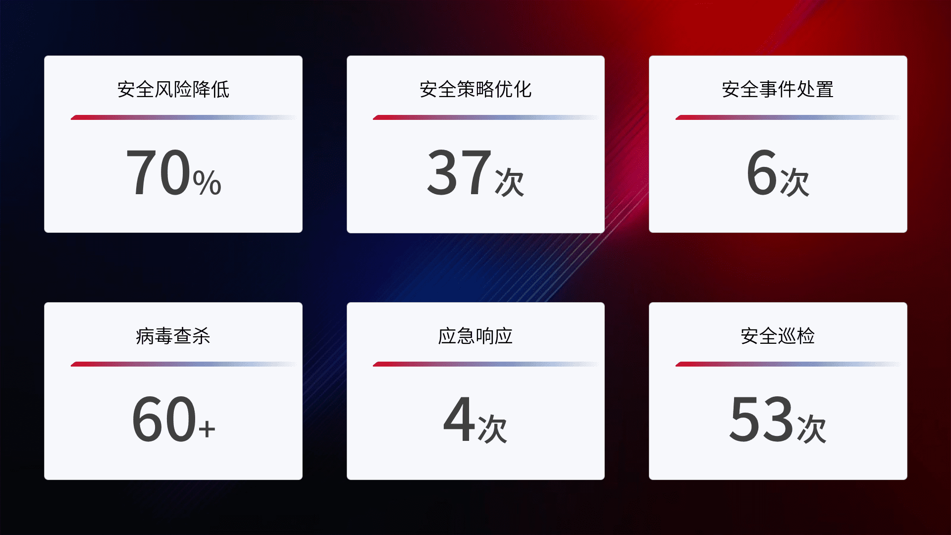 提供全面的安全事件报告体系,,,,包括处置报告、、、周报、、季度和年度总结,,,结合持续监控,,,,帮助客户深入了解网络安全状况。。