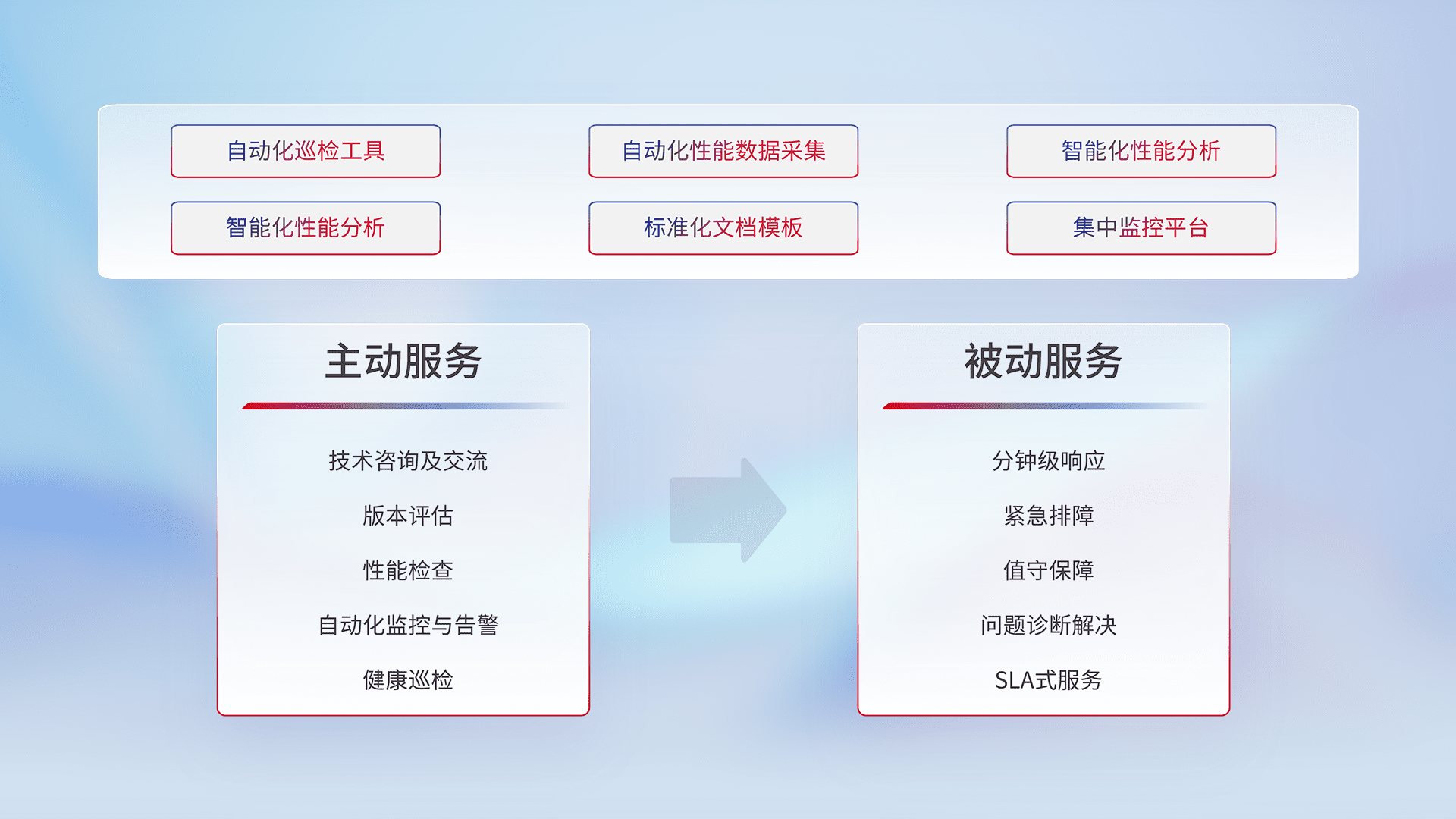 智能化工具和标准化文档,,保障服务质量,,,提供主动服务(包含技术咨询、、、、版本评估、、性能检查、、、自动化监控与告警、、、、健康巡检)和被动服务包含(分钟级响应、、紧急排障、、、值守保障、、、、问题诊断解决、、、SLA服务)。。。